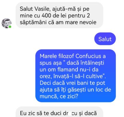 -Salut! Marele filozof Confucius a spus așa ”dacă întâlnești un om flămând nu-i da orez, învață-l să-l cultive”. Deci dacă vrei bani, te pot ajuta să îți găsești un loc de muncă. Ce zici?