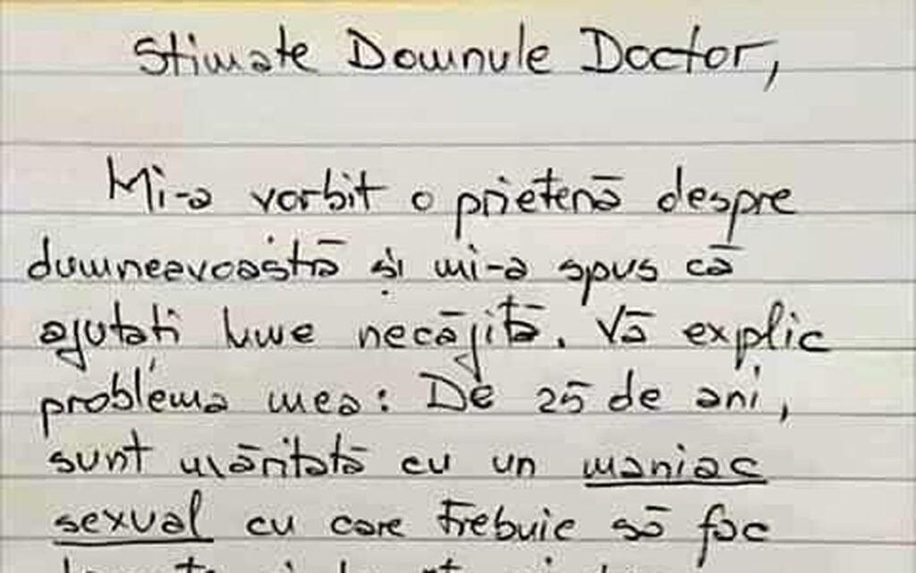 Mi-a vorbit o prietenă despre dumneavoastră și mi-a spus că ajutați lume necăjită. Vă explic problema mea: De 25 de ani, sunt măritată cu un maniac sexual cu care trebuie să fac dragoste ori de câte ori trece pe lângă mine, în orice moment al zilei. Nu mă lasă nici măcar atunci când fac mâncare, când spăl rufe, când dau cu aspiratorul, când spăl vasele și nici când..
