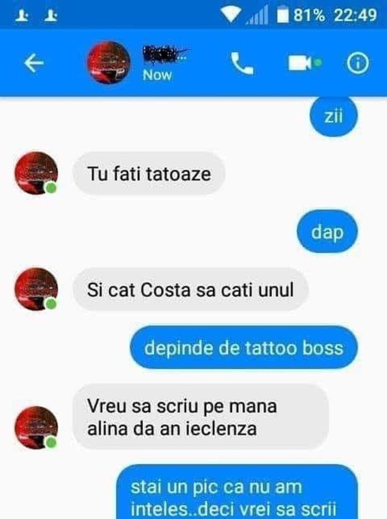„Tu fati tatoaze? Vreu sa scriu pe mana Alina da an ieclenza”