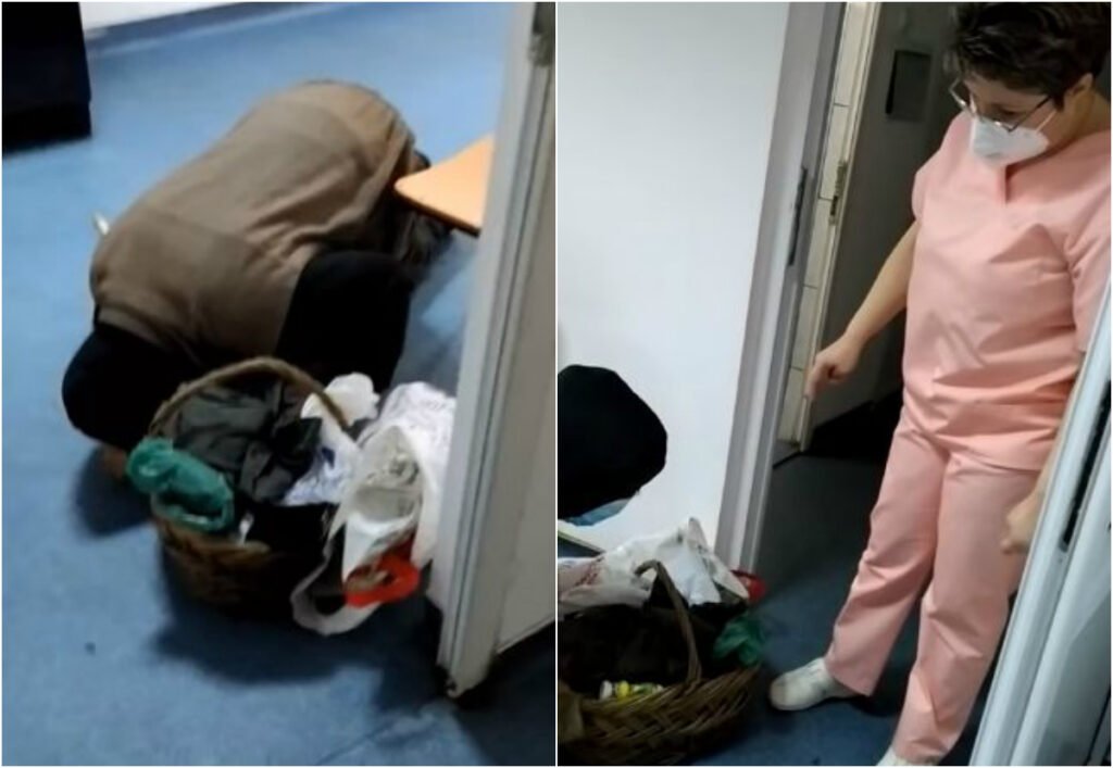 Bătrân în genunchi, filmat pe holurile spitalului