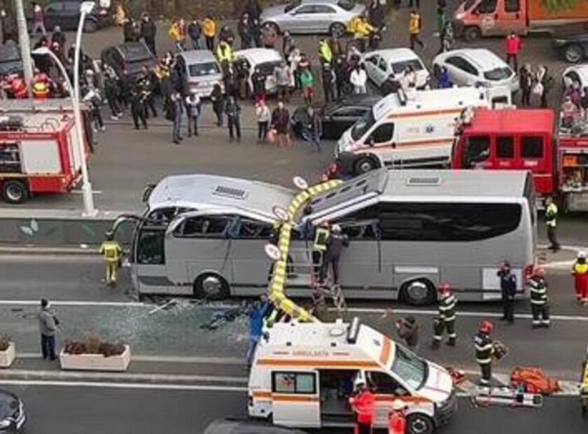 Accident în Pasajul Unirii: şoferul unui autocar nu a observat limita de înălțime, iar plafonul a fost strivit de barieră. Patru persoane sunt încarcerate
