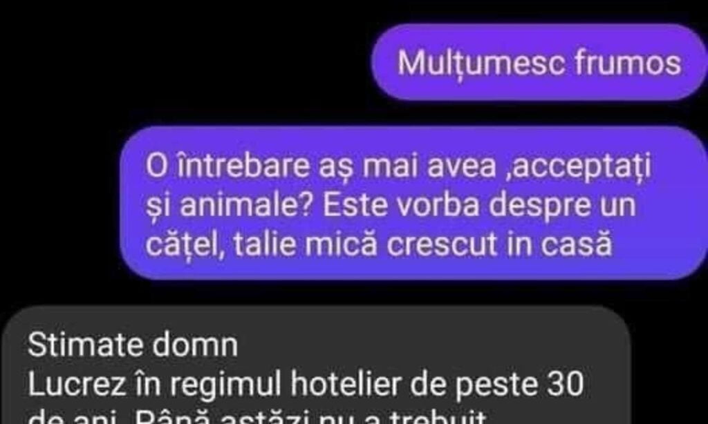 Discuția între un ieșean și proprietarul unui hotel din Brașov s-a viralizat rapid. Clientul a vrut să știe dacă poate sa-și ia și animalul de companie în vacanță, iar răspunsul pe care l-a primit a fost de-a dreptul haios.