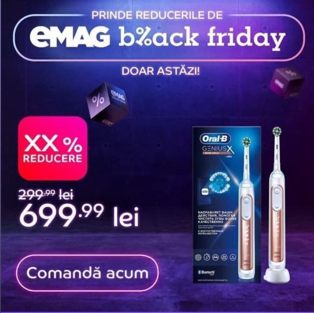 În vasta ofertă de Black Friday oferită de eMAG a apărut și o periuță de dinți electrică vândută cu 699,99 de lei, redusă de la, atenție, 299,99 lei!