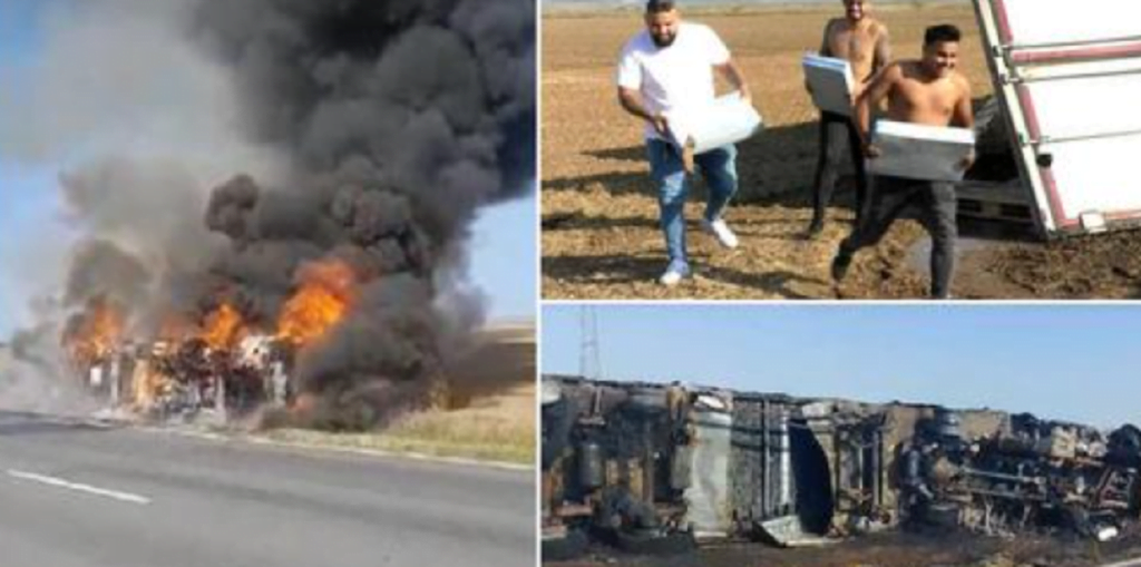 Incendiu puternic, ieri după-amiază, pe un drum naţional din judeţul Mehedinţi. Un TIR încărcat cu caşcaval s-a aprins ca o torţă, în mers, după ce un cauciuc a explodat. Şoferul a pierdut controlul volanului și s-a răsturnat cu TIR-ul într-un şanţ. Imediat după ce focul a fost lichidat, localnicii din zonă s-au gândit să profite, aşa că s-au pus pe adunat caşcaval.