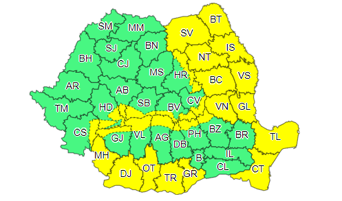 În continuare, sud-estul țării se află sub cod portocaliu de viscol. Până la ora 20:00, în estul și nord-estul Munteniei, Dobrogea și jumătatea de sud a Moldovei va ninge și va fi viscol. Vântul va avea intensificări susținute, cu rafale în general de 85…90 km/h, iar vizibilitatea va scădea sub 50 m. În Carpații Meridionali și de Curbură vor fi intensificări susținute ale vântului, cu rafale de 90…110 km/h, va ninge și va fi viscol iar vizibilitatea va scădea sub 50 m.