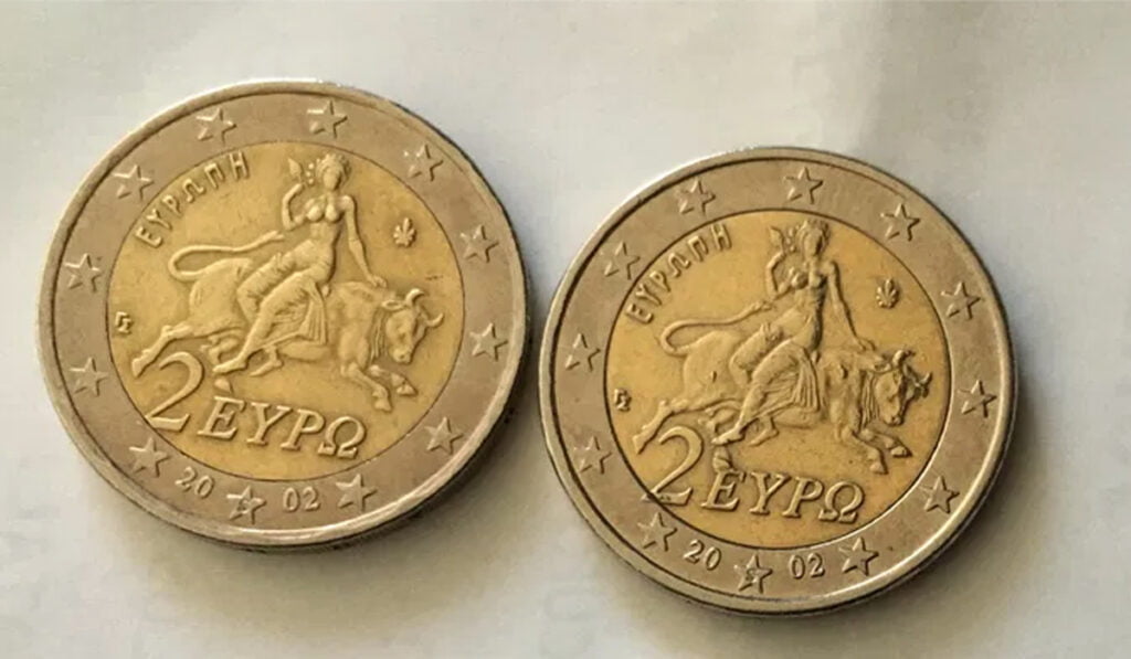Spre exemplu, o monedă de 2 euro grecească bătută greșit în 2002 este scoasă la vânzare pe un site specializat din România pentru 100.000 de euro (aproximativ 500.000 de lei).