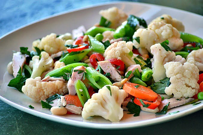 Legumele fierte și tăiate felii se amestecă cu ardeiul gras, tăiat julien și cu un sos făcut din ulei, muștar și sare. Se amestecă foarte ușor. Se decorează cu roșii și buchete de conopidă.