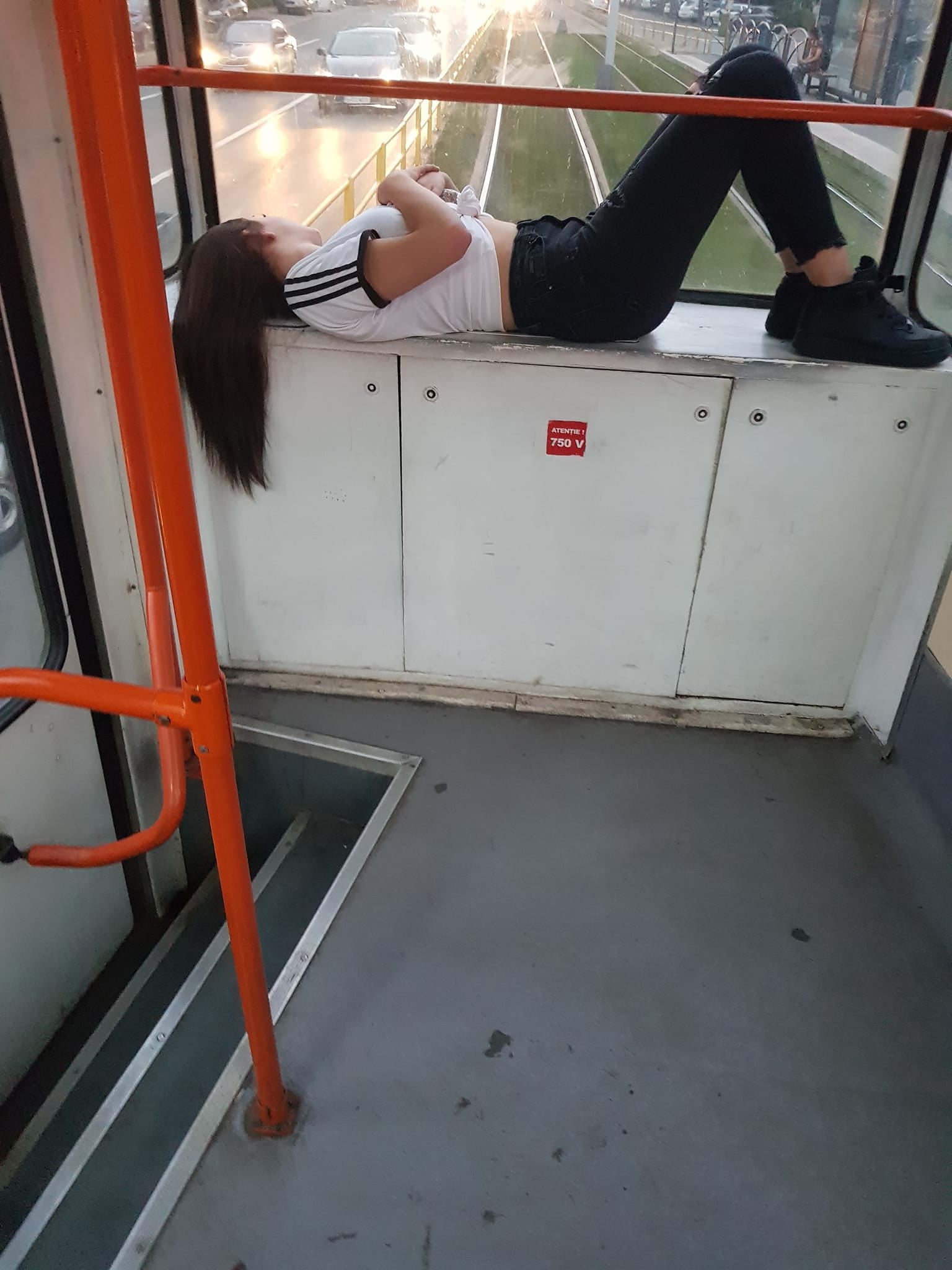 Tănăra, care pare destul de relaxată, s-a fotografiat în timp ce stătea întinsă pe partea metalică din spatele tramvaiului, acolo unde a găsit o modalitate de a se face confortabilă în timpul călătoriei.