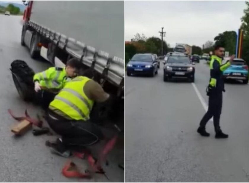 Trei agenți de poliție au ajutat un șofer de TIR să repare o pană, după ce acesta a rămas blocat într-o intersecție din Hunedoara: “Așa da…Respect!”