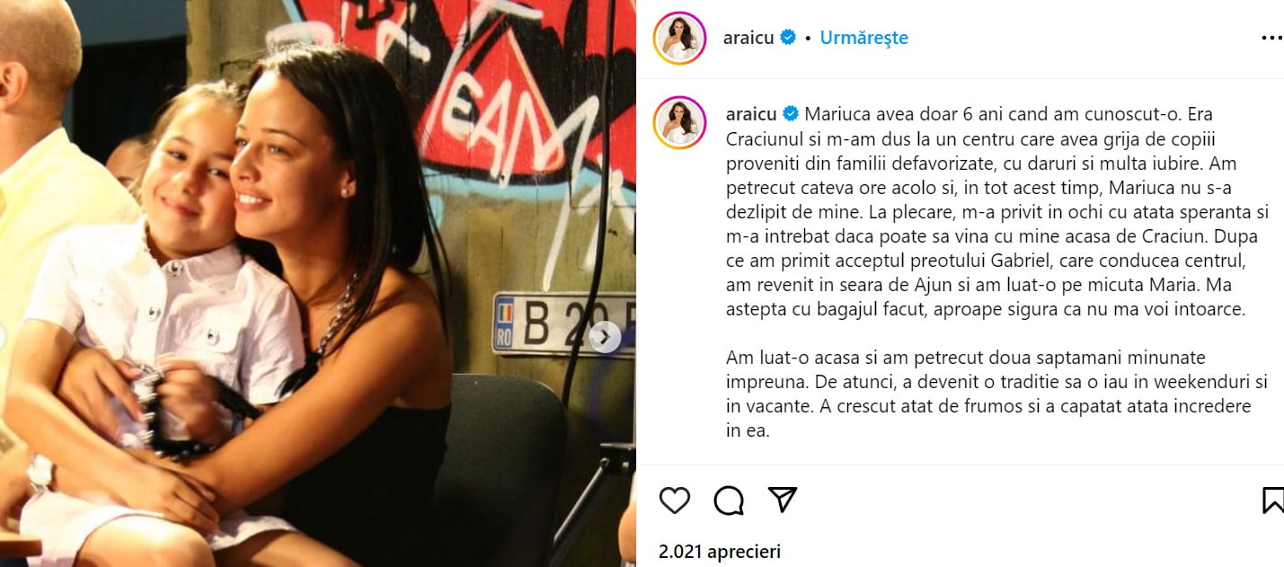 “Mariuca avea doar 6 ani cand am cunoscut-o. Era Craciunul si m-am dus la un centru care avea grija de copiii proveniti din familii defavorizate, cu daruri si multa iubire. Am petrecut cateva ore acolo si, in tot acest timp, Mariuca nu s-a dezlipit de mine. La plecare, m-a privit in ochi cu atata speranta si m-a intrebat daca poate sa vina cu mine acasa de Craciun. Dupa ce am primit acceptul preotului Gabriel, care conducea centrul, am revenit in seara de Ajun si am luat-o pe micuta Maria. Ma astepta cu bagajul facut, aproape sigura ca nu ma voi intoarce.