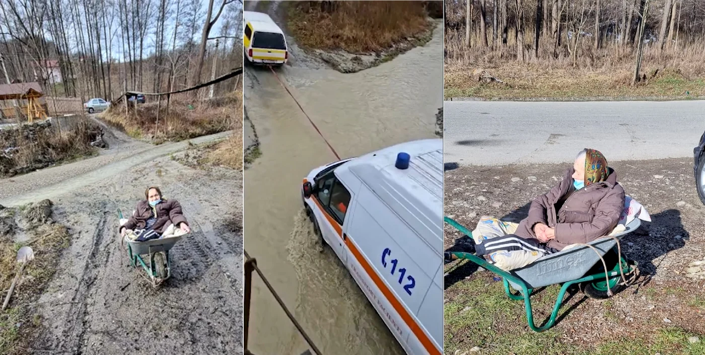 Femeia de 85 de ani se întorcea de la spital, unde i-a fost amputat piciorul stâng. Fiul său, şi el cu probleme de sănătate, dar şi alte două persoane din zonă sunt transportate tot cu roaba ori de câte ori plouă mai tare şi pârâul din zonă se umflă, blocând astfel accesul maşinilor pe drum. Deşi autorităţile locale cunosc situaţia, acestea spun că nu au, în acest moment, fondurile necesare pentru construirea unei punţi pietonale.