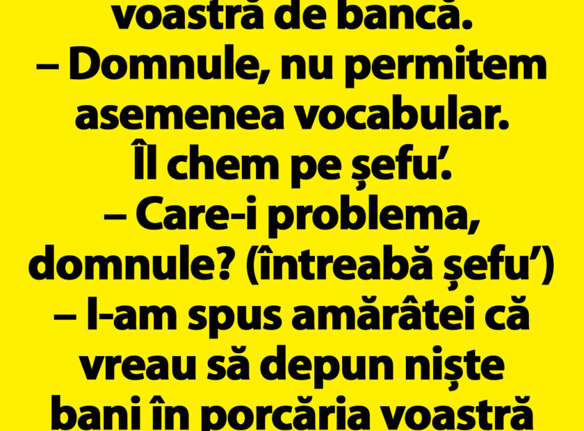 Bancul zilei. Bulă intră într-o bancă. La ghișeu, îi zice funcționarei: – Duduie, vreau să pun niște bani în nenorocita voastră de bancă.