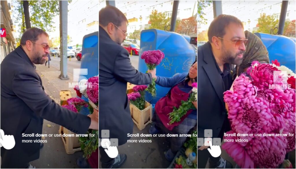 Pe lângă suma de bani oferită, cântărețul de manele i-a mai făcut o surpriză vânzătoarei, i-a dăruit și buchetul de flori cumpărat.